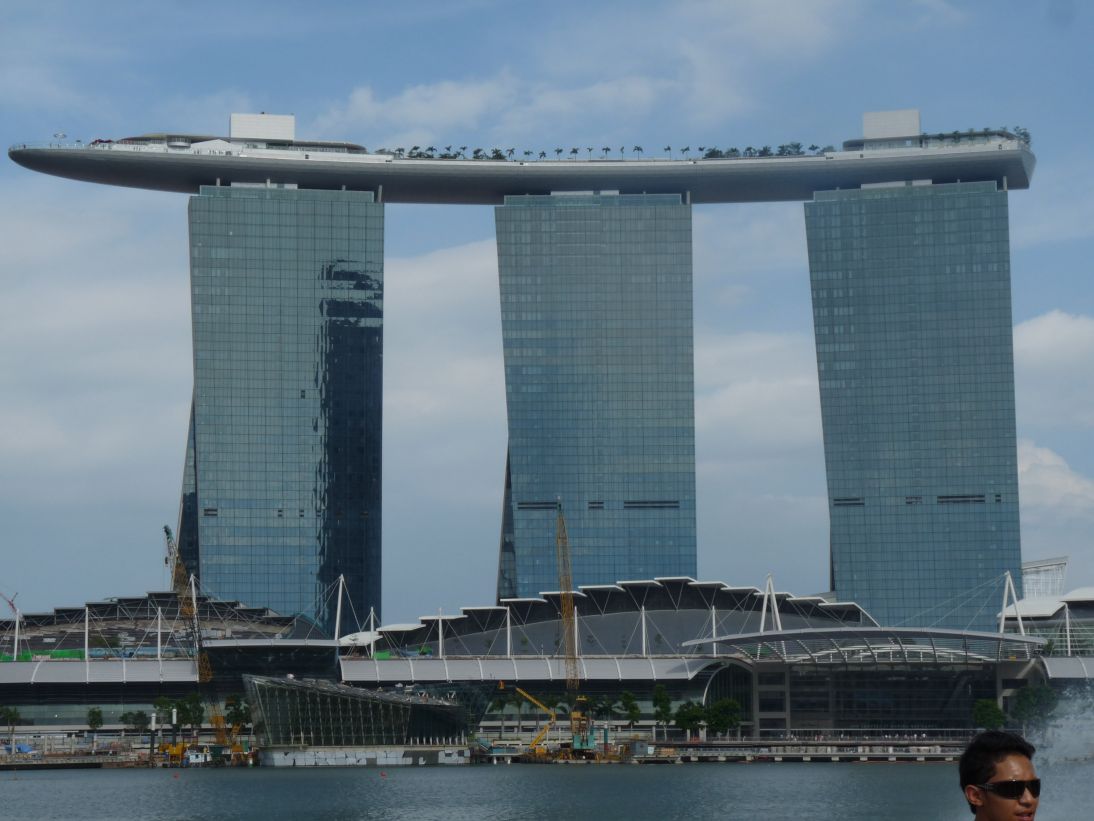 Von dort hatte man dann auch einen tollen Blick auf das Marina Bay Sands Gebäude. Ein riesiges Resort mit Hotel, Kasino und Musical-Theater. Bei meinem Besuch früher dieses Jahr war das Gebäude dann noch im Bau und wurde im Juli oder August feierlich eröffnet. Gebaut mit 3 hohen Gebäuden und einem großen Gebilde oben drauf, dass die Türme verbindet.